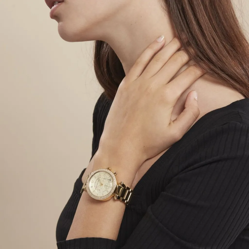 Montre Michael Kors Parker Chrono Acier Dore Ronde Quartz 39mm Fond Champagne Bracelet Acier Dore Mk5354