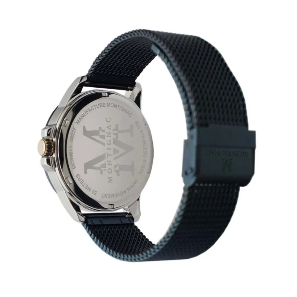 Montre Montignac Round Acier Argenté Ronde Quartz 42mm Fond Bleu Bracelet Maille Milanaise Acier Bleu Mow611