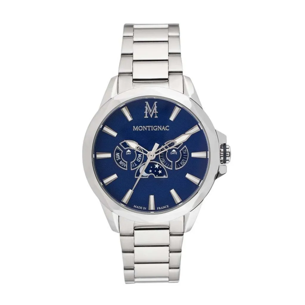 Montre Montignac Round Multifonction Acier Argente Ronde Quartz 42mm Fond Bleu Lunette Argentee Bracelet Acier Argente Mow908