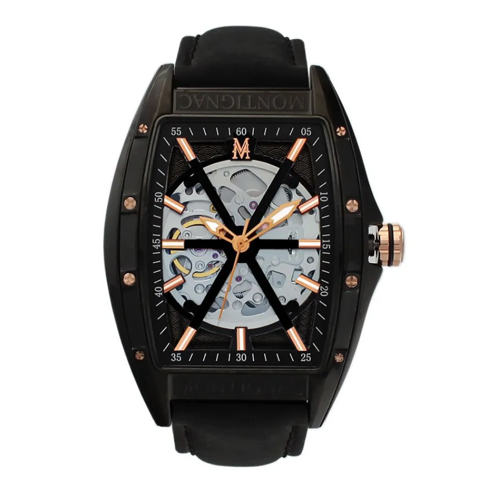 Montre Montignac Tonneau Automatique Acier Noir Tonneau Auto 45mm Fond Noir Bracelet Cuir Noir Mow506