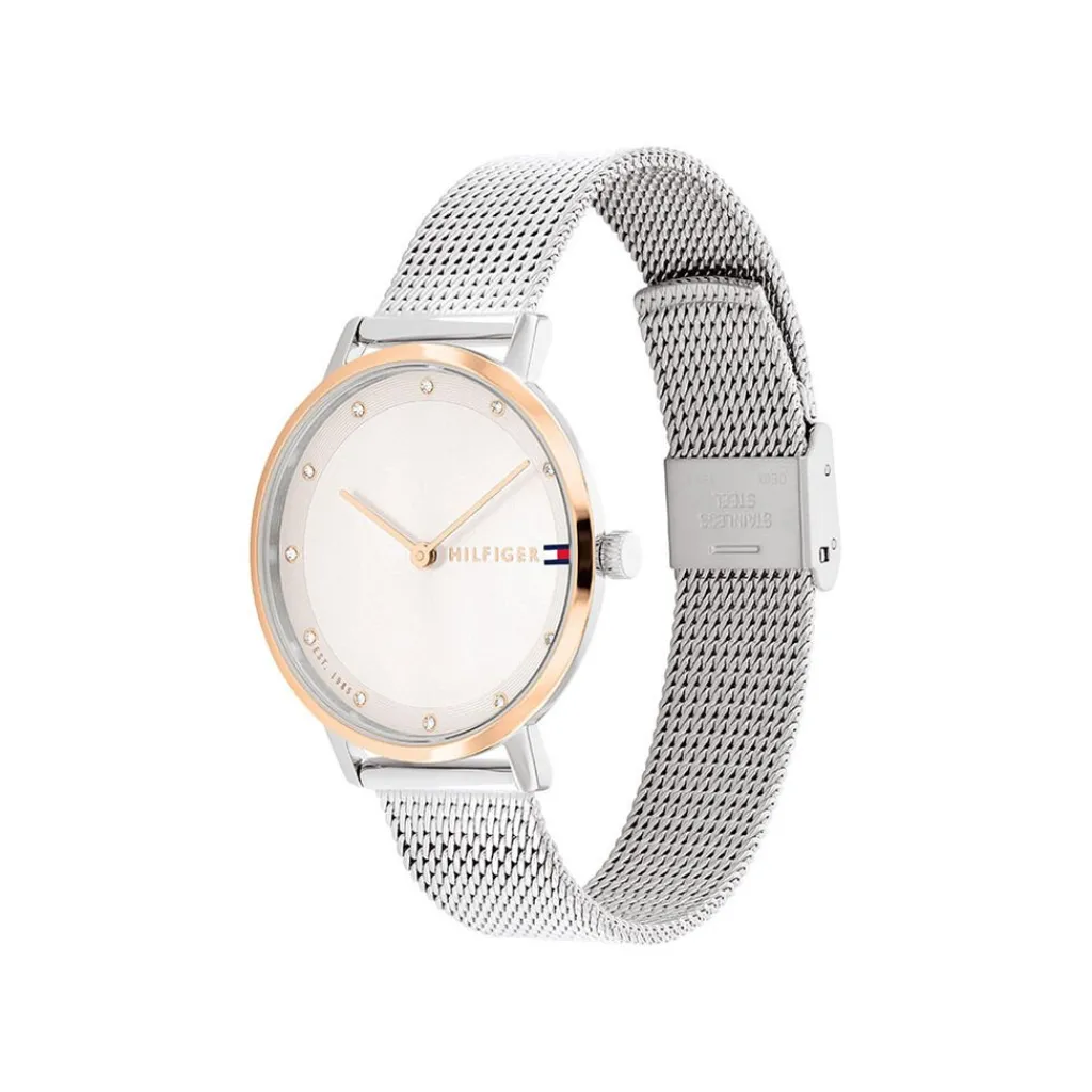 Montre Tommy Hilfiger Pippa Acier Doré Rose Ronde Quartz 34mm Fond Rose Bracelet Maille Milanaise Acier Argenté 1782666