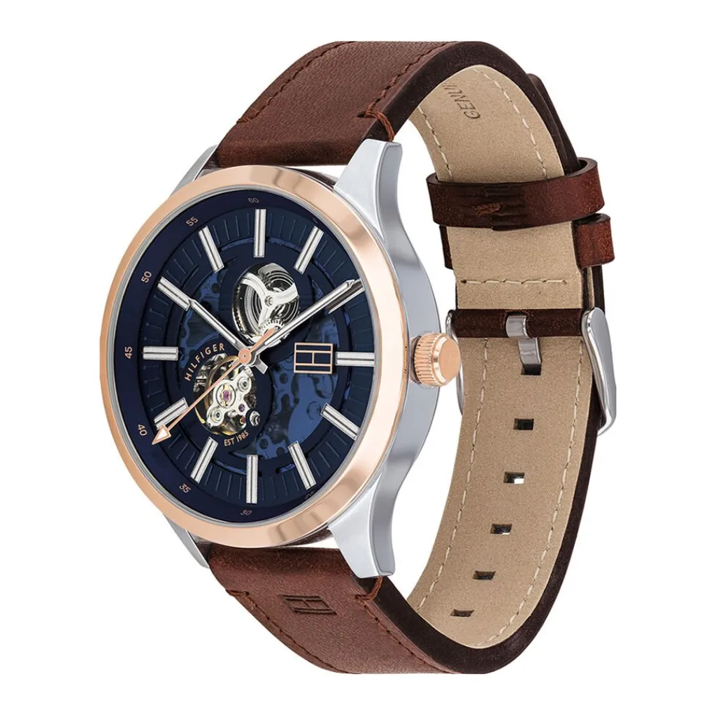 Montre Tommy Hilfiger Spencer Acier Blanc Ronde Automatique 44mm Fond Bleu Bracelet Cuir Marron 1791642