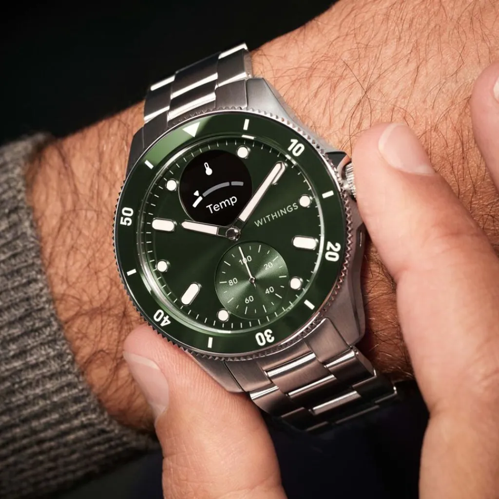 Montre Withings Scanwatch Nova Acier Inoxydable Ronde Argente Connectee 42mm Fond Vert Bracelet Acier Inoxydable Argente Wswngreen